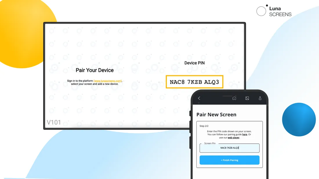 AlastairThis article talks about how to pair a screen using our Luna Screens digital signage platform. Requirements Step 1: Create a screen On the platform home page, tap 'Pair New Screen'. Give the screen a name that makes it easy for you to identify it, you can optionally add a description that will help