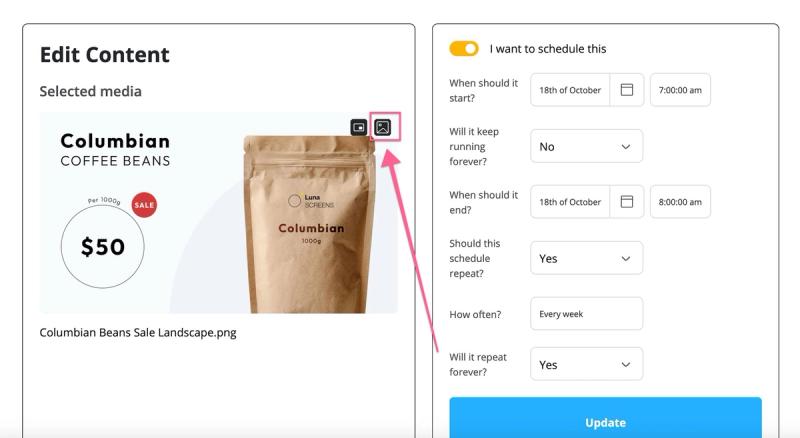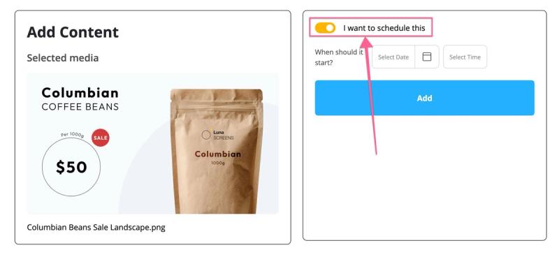 Select our coffee bean promo content but this time toggle on the 'I want to schedule this' option.