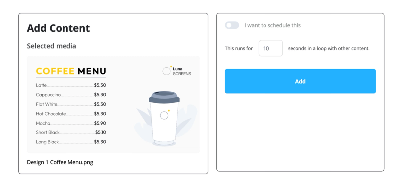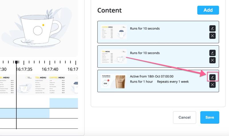 But wait, showing only the coffee beans promo on my screen for that hour is not ideal. I still want to show the regular coffee menu and the promo content during the hour, what can I do? That's where we can make use of nested playlists