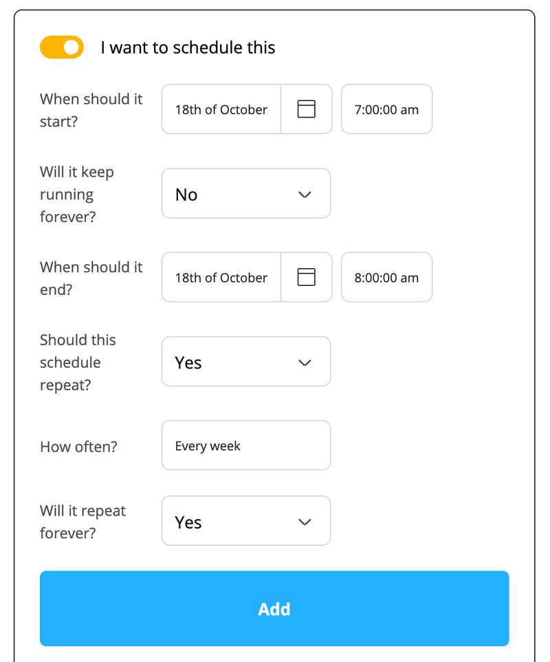 But we wanted this to run every Friday, not just for a single date, so let's select 'Yes' to 'Should this schedule repeat?' and we'll select it should repeat every week.