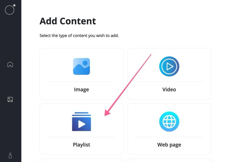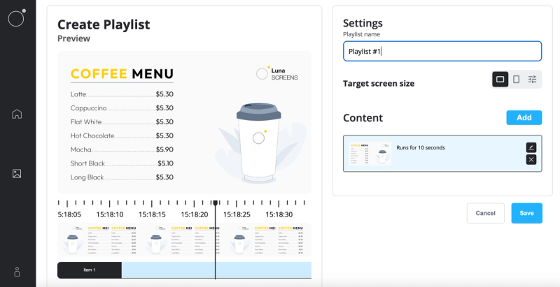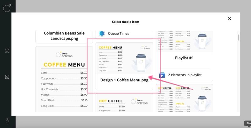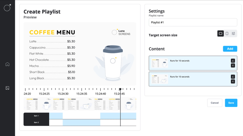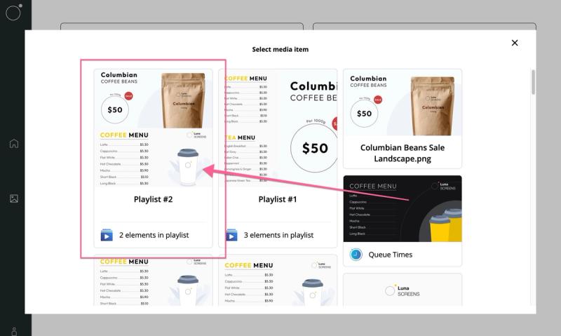 Let's create a simple playlist that alternatives between a coffee and tea menu every 10 seconds. Let's start by creating a playlist by navigating to our media library, creating a new item and selecting 'Playlist'.