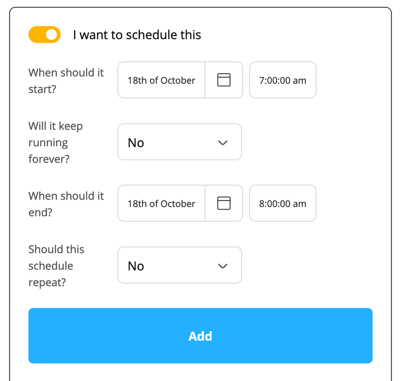 Now because we only want it to run for an hour we'll select 'No' for 'Will it keep running forever?' and we'll set it to end at 8AM.