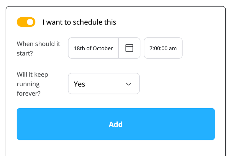 And lastly for 'Will it repeat forever?' we'll select Yes, you'd set a date if you wanted the repeat rule to stop at a certain point but leaving it running is fine for us, we can always change it later if we decide to stop running our promotion.