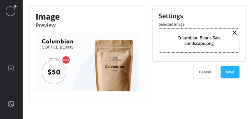 Here you select what type of content you're adding, in most cases you'll bring your image and video content here. But we also support other content types, like a weather widget, clock, a Google Slides integration, etc. See our full list on our supported content types page.